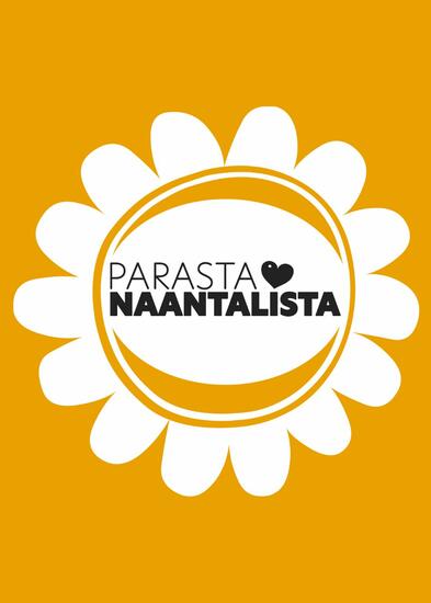 Keltaisella taustalla valkoinen aurinko, jossa keskellä teksti: Parasta Naantalista.