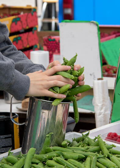 Nuori torimyyjä työntää herneitä mitta-astiaan torikojulla, taustalla näkyy marjoja.