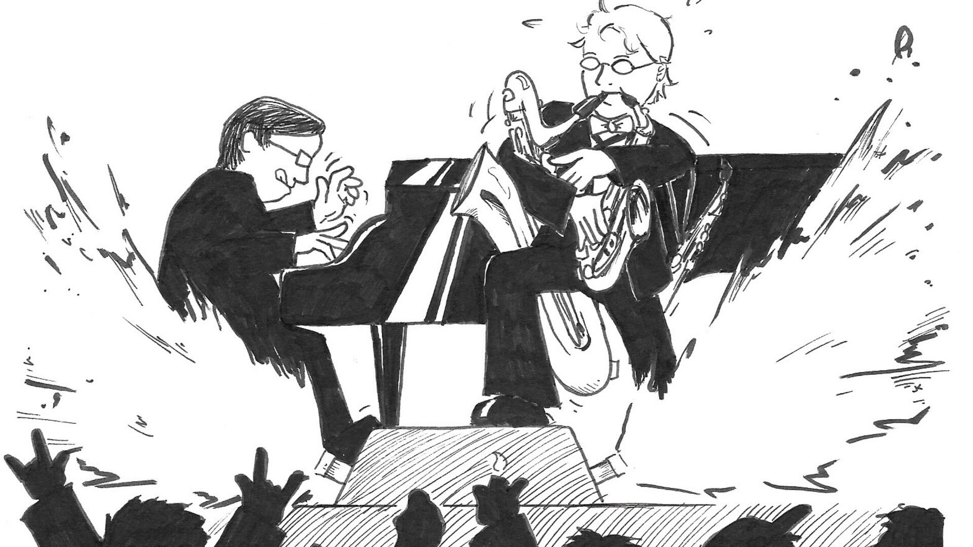 Juha Koivusalon piirros Olli-Pekka Tuomisalosta ja Risto-Matti Marinista konsertissa.