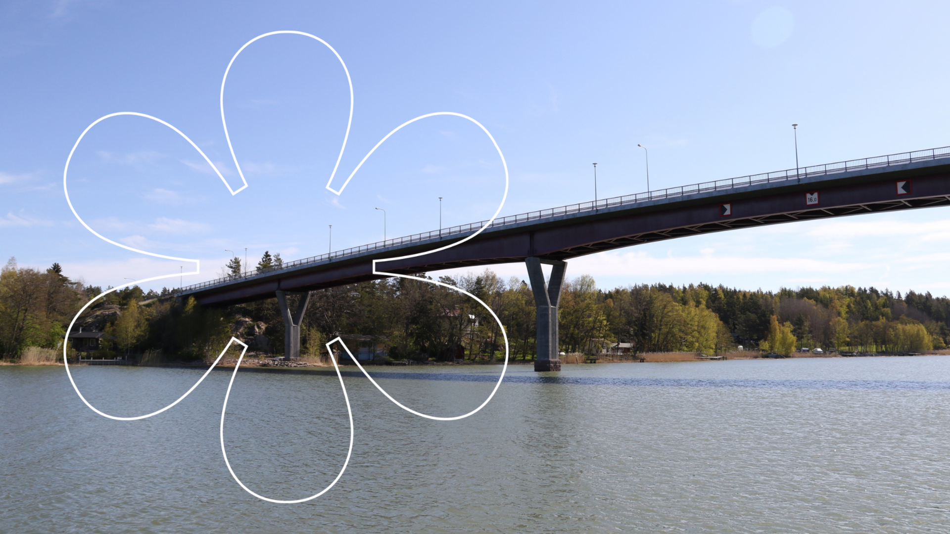 Kirkonsalmen silta Merimaskussa, kuvan päällä Onnellinen aurinko -tunnus.