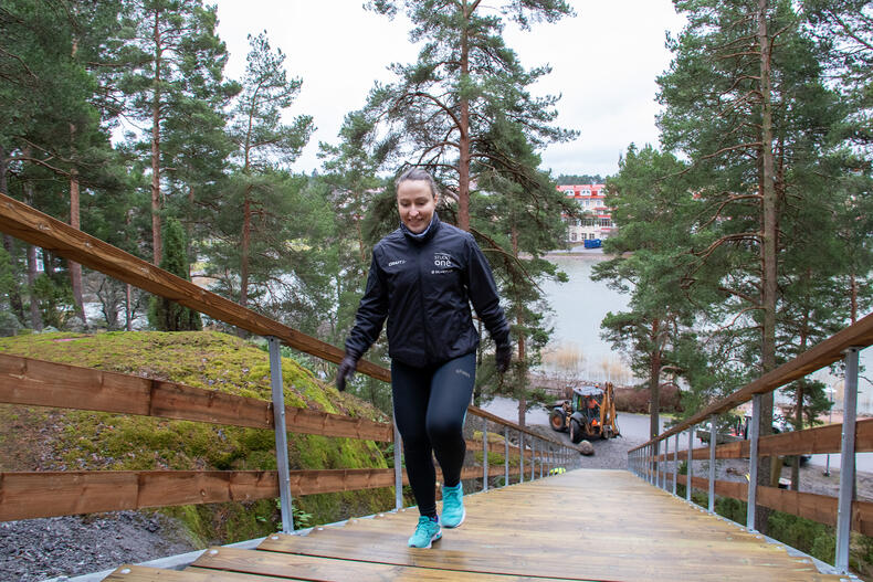 Sini Tuomi kävelee kuntoportaissa, taustalla näkyy Kalevanlahti ja Naantalin kylpylä.