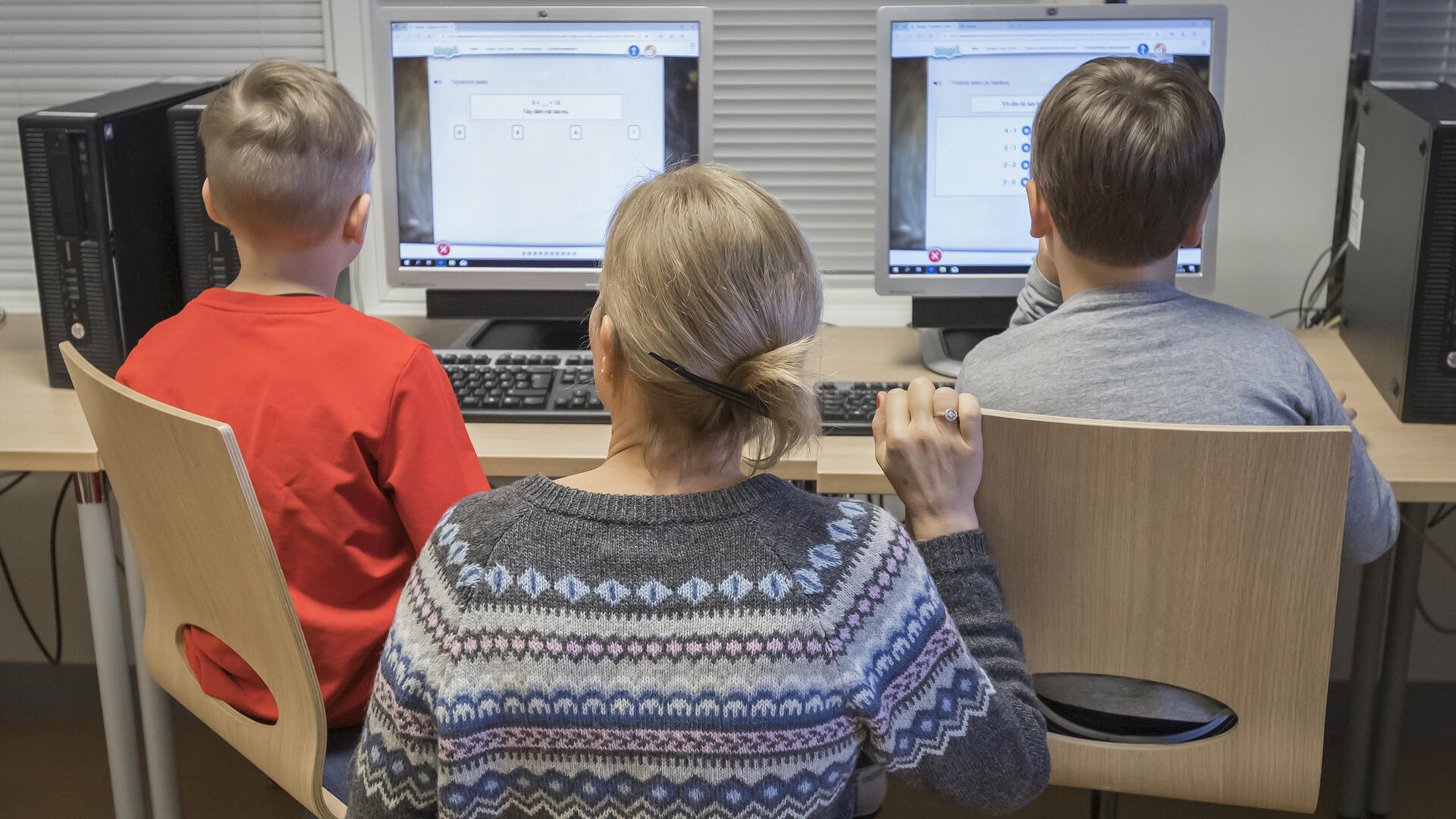 Opettaja neuvoo oppilaita tietokoneen äärellä.