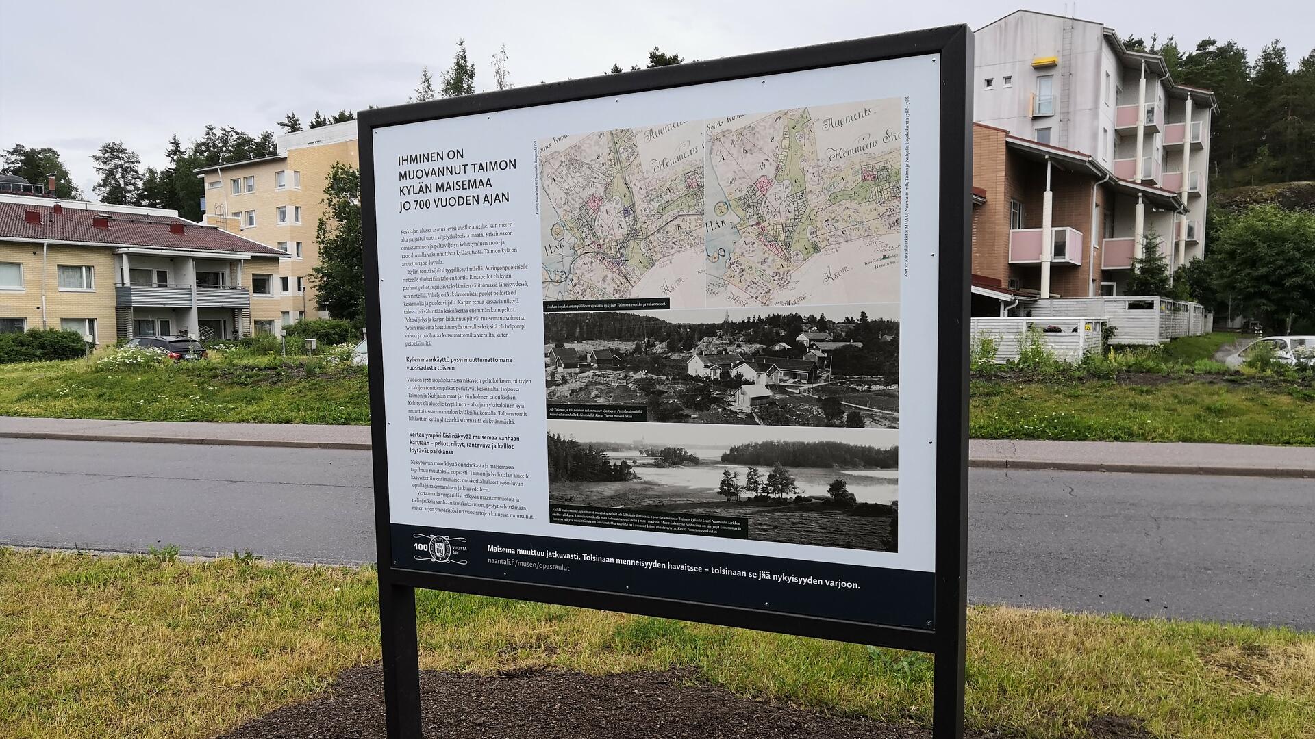 Ulkona metallikehyksessä seisova opastaulu ja taustalla kerrostaloja