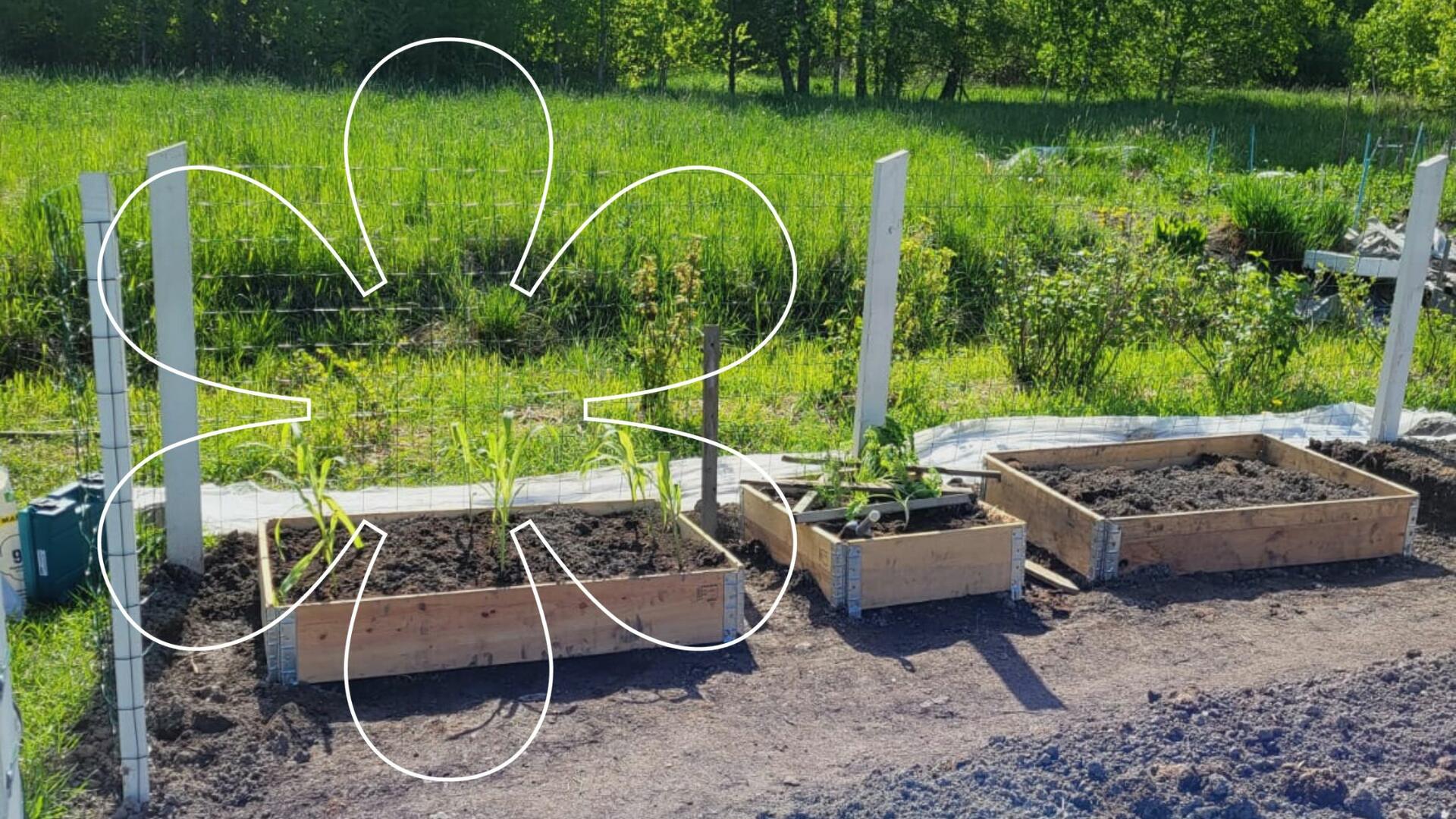 Viljelylaatikoita palstan reunassa. Onnellinen aurinko -elementti.