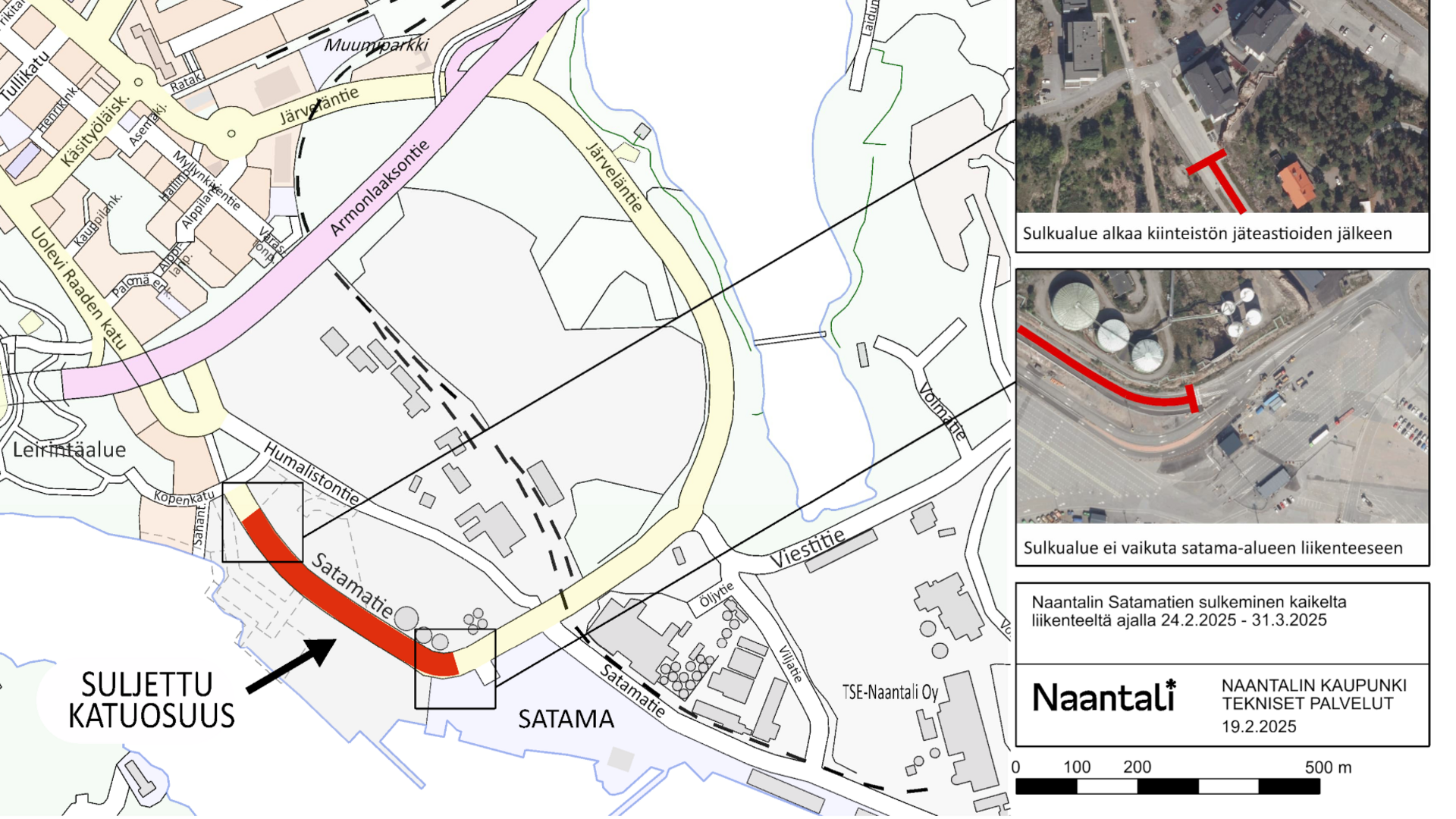 Kaikki liikenne Naantalin satamaan aikavälillä 24.2 – 31.3.2025 kulkee vain Viestitien ja Järveläntien kautta. Sulku koskee myös pyöriä ja jalankulkua. Tie avataan liikenteelle heti, kun se töiden etenemisen kannalta on turvallista, viimeistään 31.3.2025.