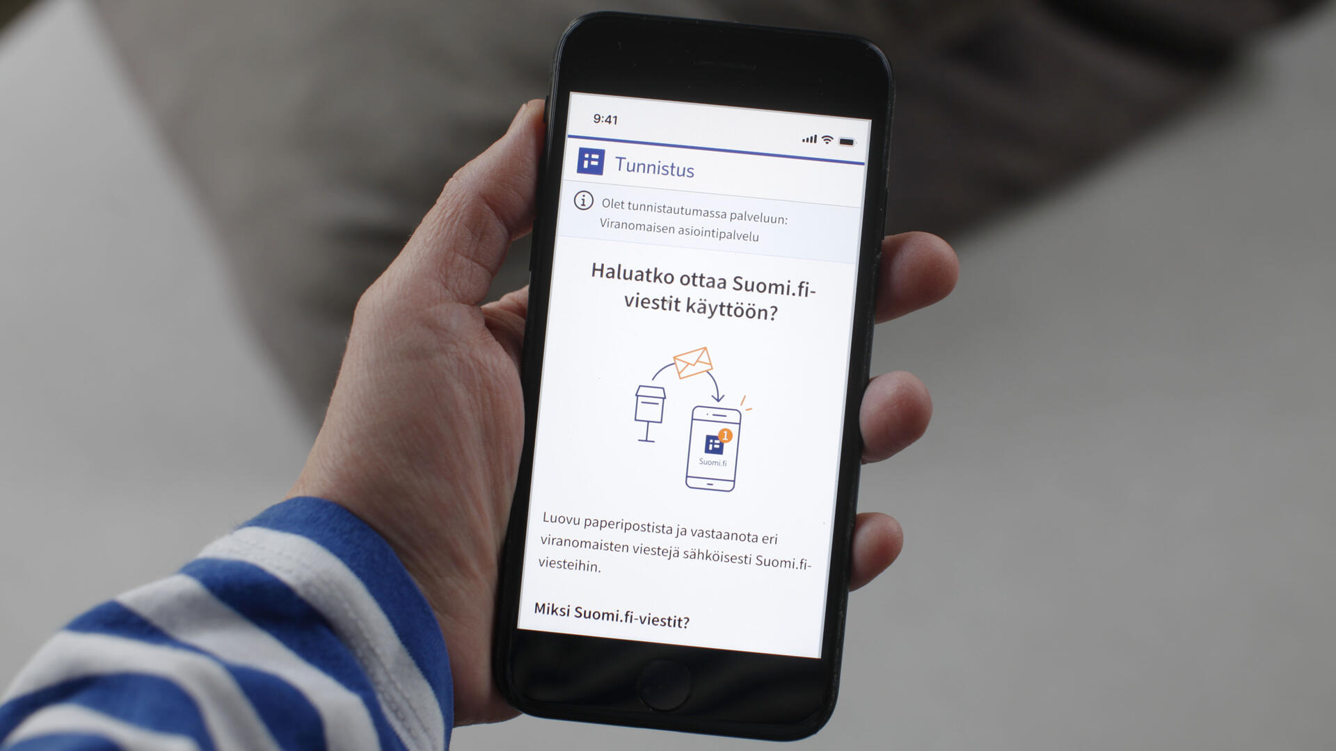 Käsi pitelee kännykkää, jossa näkyy kehote suomi.fi-viestien käyttöönotosta.