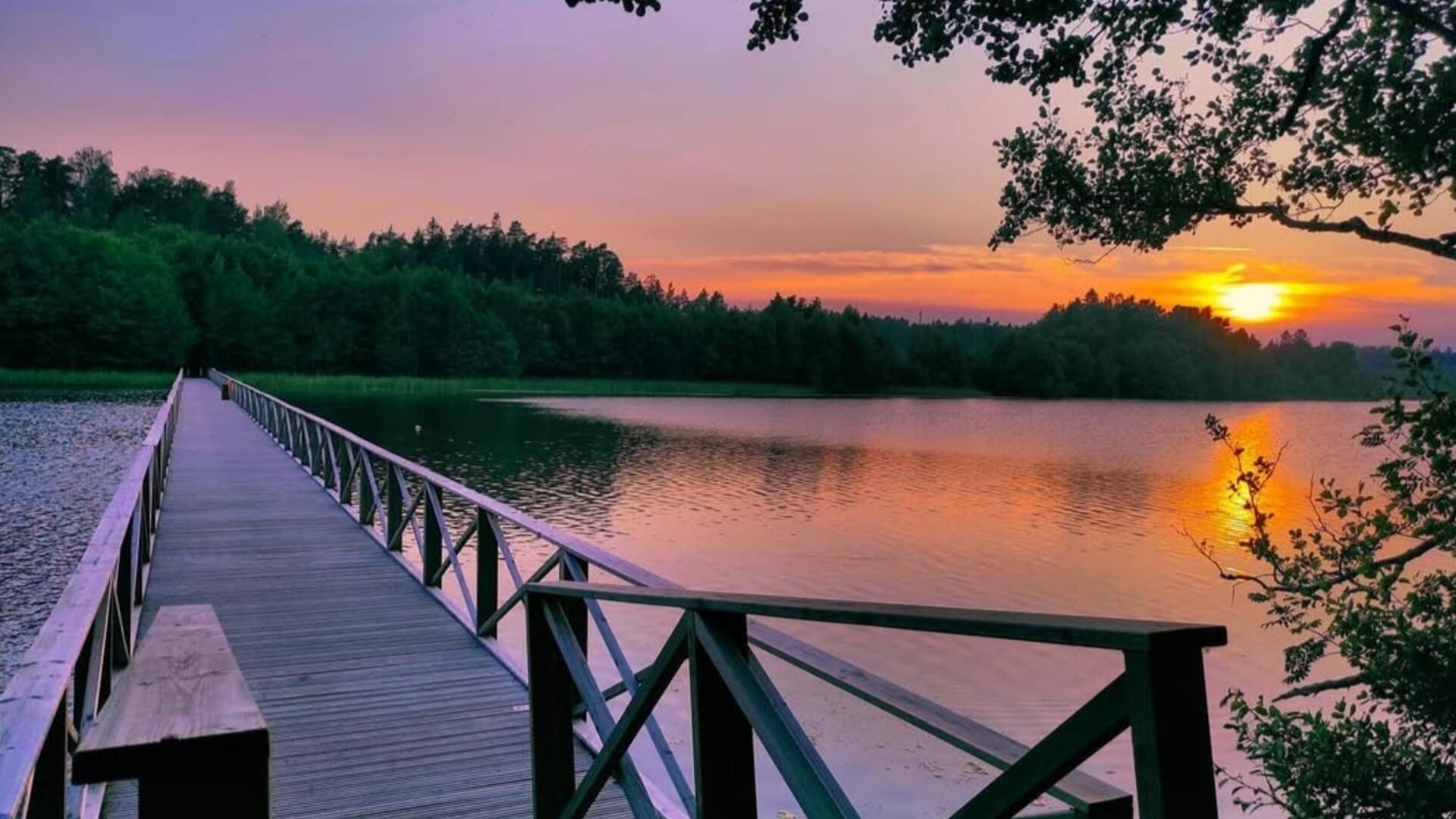 Luolalanjärvi auringonlaskun aikaan ja järven poikki kulkeva puusilta.