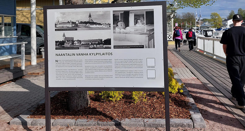 Opastaulu Naantalin vanhasta kylpylaitoksesta rannan laiturin äärellä.