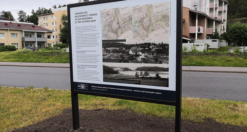 Kulttuurimaisemataulu Taimon asuinalueella.